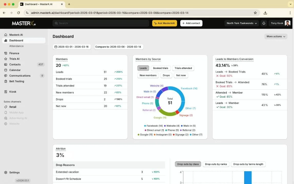MasterK helps owners and staff manage leads, billing, attendance, communication, and reporting in one connected system, while giving clearer visibility into what needs attention across the business.